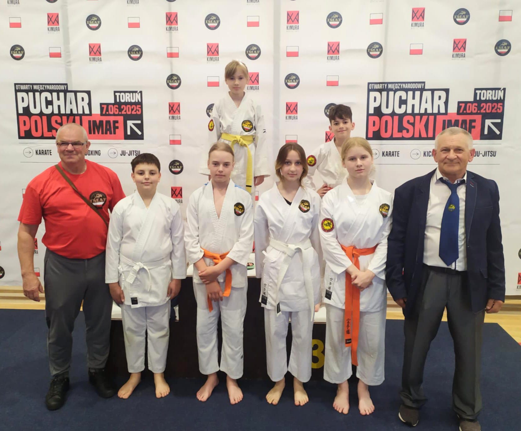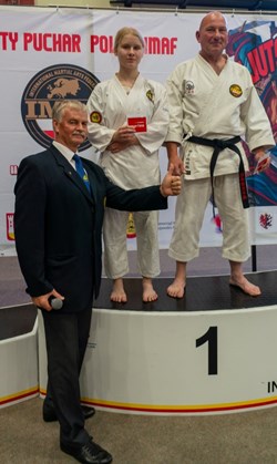 Dużym sukcesem zakończył się udział naszych zawodników w Pucharze Polski IMAF w Karate, Kickboxingu i Ju Jitsu. Zawody te odbyły się 07 czerwca w Toruniu. W klasyfikacji drużynowej na czternaście startujących zespołów zajęliśmy piątą lokatę, zdobywając łącznie 11 medali. Pierwsze lokaty zdobyli Franciszek Orzechowski (Ju Jitsu), Jan Jabłoński (Karate Kata i Karate Kihon Ippon Kumite), Tatiana Lajblich (Karate Kata). Drugie lokaty w Ju Jitsu wywalczyli Jan Wesołowski, a także w swoich kategoriach wagowych Jan Jabłoński i Tatiana Lajblich. Tatiana Lajblich i Maria Tsybukh wywalczyły także drugie lokaty w Karate Kihon Ippon Kumite. Na trzecim stopniu podium stanęli Witold Bolewski (Ju Jitsu) i Maria Tsybukh (Karate Kata). Warto wspomnieć, że Franciszek Orzechowski i Jan Wesołowski na co dzień trenują w sekcji Rojewo pod okiem sensei Mariana Waszaka – sama sekcja, chociaż istnieje od niedawna, może już pochwalić się niezłym poziomem sportowym i medalowymi sukcesami na coraz większych imprezach! Tym razem minimalnie poza podium znaleźli się Natalia Stocka i Igor Żurawski.